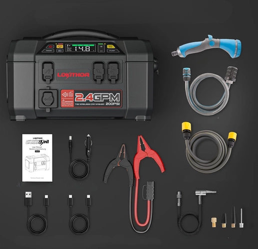 - Lokithor AW401 – wszechstronny jump starter 5w1: booster 2500A, powerbank 20000 mAh, kompresor 150 PSI, myjka ciśnieniowa 1,5 MPa i latarka 500 lm. Idealny do auta i podróży.