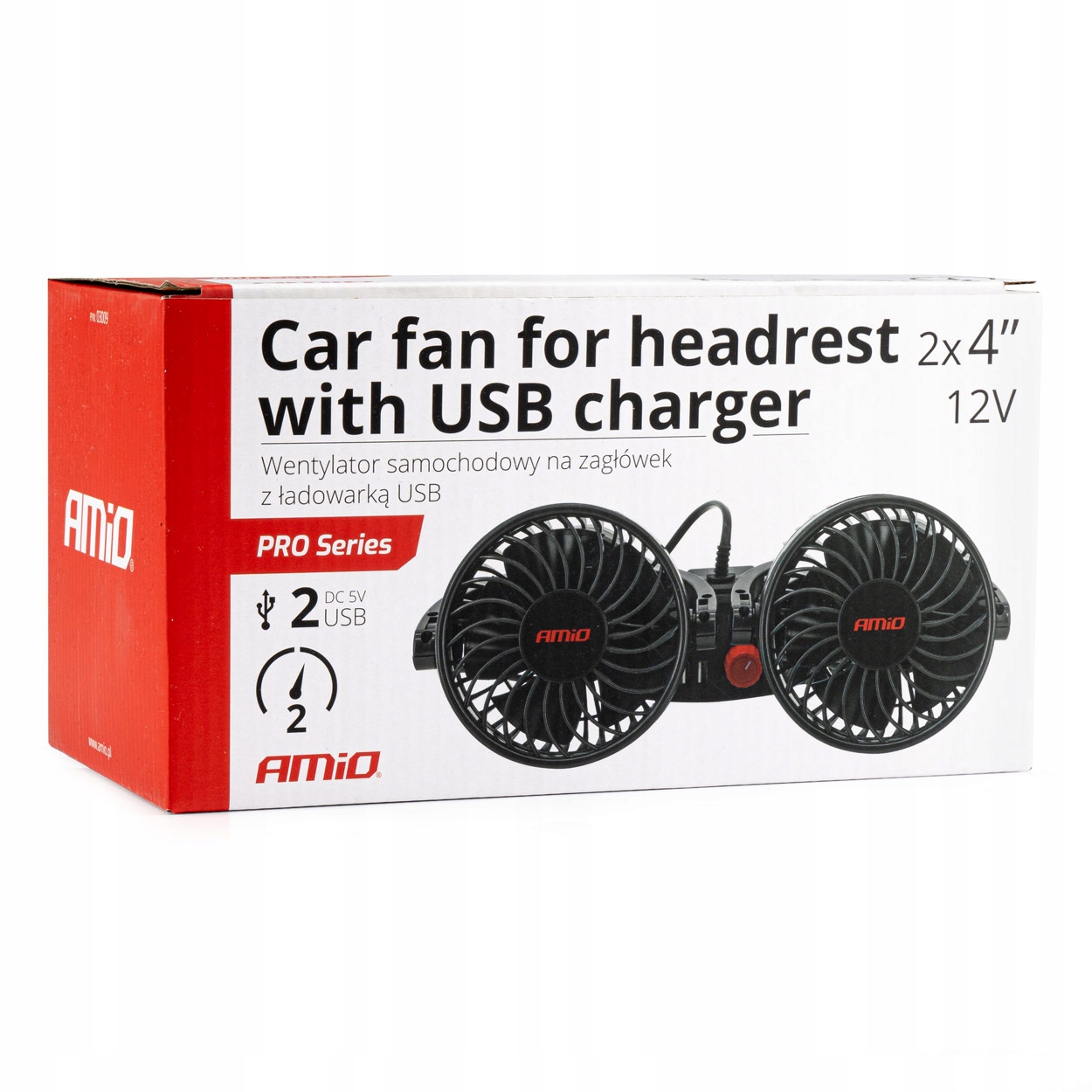Podwójny wiatrak samochodowy wentylator na zagłówek z ładowarką 2x USB 12V mocowany na zagłówek