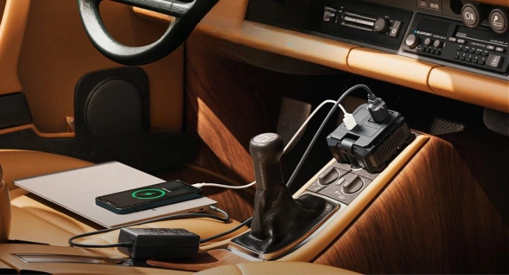 Wbudowany przetwornik samochodowy umożliwia konwersję ładowania z gniazda zapalniczki na różne tryby zasilania, w tym wyjście AC 120 W, PD 30 W, szybkie ładowanie 5V/9V/12V oraz gniazdo zapalniczki — do ładowania wszystkich niezbędnych urządzeń.