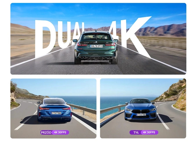 To pierwsza tak kompaktowa kamera samochodowa, nagrywająca w prawdziwym 4K z przodu i 4K z tyłu, zapewniając jakość obrazu porównywalną z filmem kinowym.