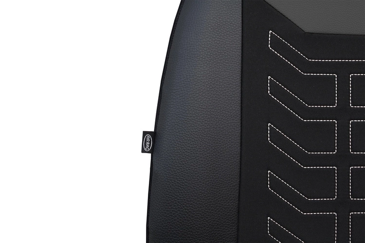 Do ich produkcji wykorzystano mocną tkaninę tapicerską połączoną ze skórą ekologiczną o fakturze zbliżonej do naturalnej. Charakterystyczne przeszycia nadają wnętrzu samochodu eleganckiego wyglądu, a całość wyróżnia się zwiększoną odpornością na ścieranie i intensywną eksploatację.