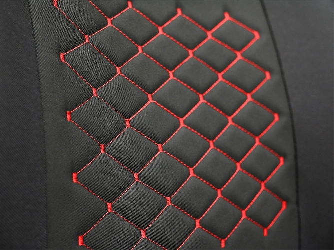 Do ich produkcji wykorzystano wysokiej jakości tkaninę tapicerską, odporną na ścieranie i zabrudzenia. Liczne przeszycia wykonane kolorowymi nićmi nadają pokrowcom wyjątkowego charakteru, podkreślając styl wnętrza samochodu i podnosząc prestiż całego produktu.